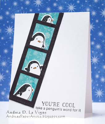 I got the inspiration for my second card also through Pinterest. I began by cutting 2 pieces of kraft cardstock to 4.25" wide. I taped them together, overlapping them about an inch, and die cut through both layers with one of the "Snow Drifts" dies from My Favorite Things. I then separated the panels and trimmed them down to fit an A2 card, with a 1.25" gap in between.
